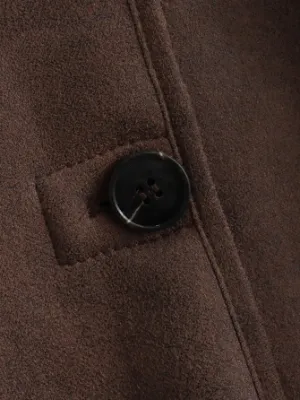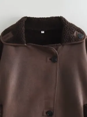The front of the jacket features two black buttons located on the chest for easy closure and adding a touch of retro style. The sleeves and the chest area are decorated with black plush patches, not only adding layers but also enhancing the warmth, making the overall design practical and aesthetically pleasing.